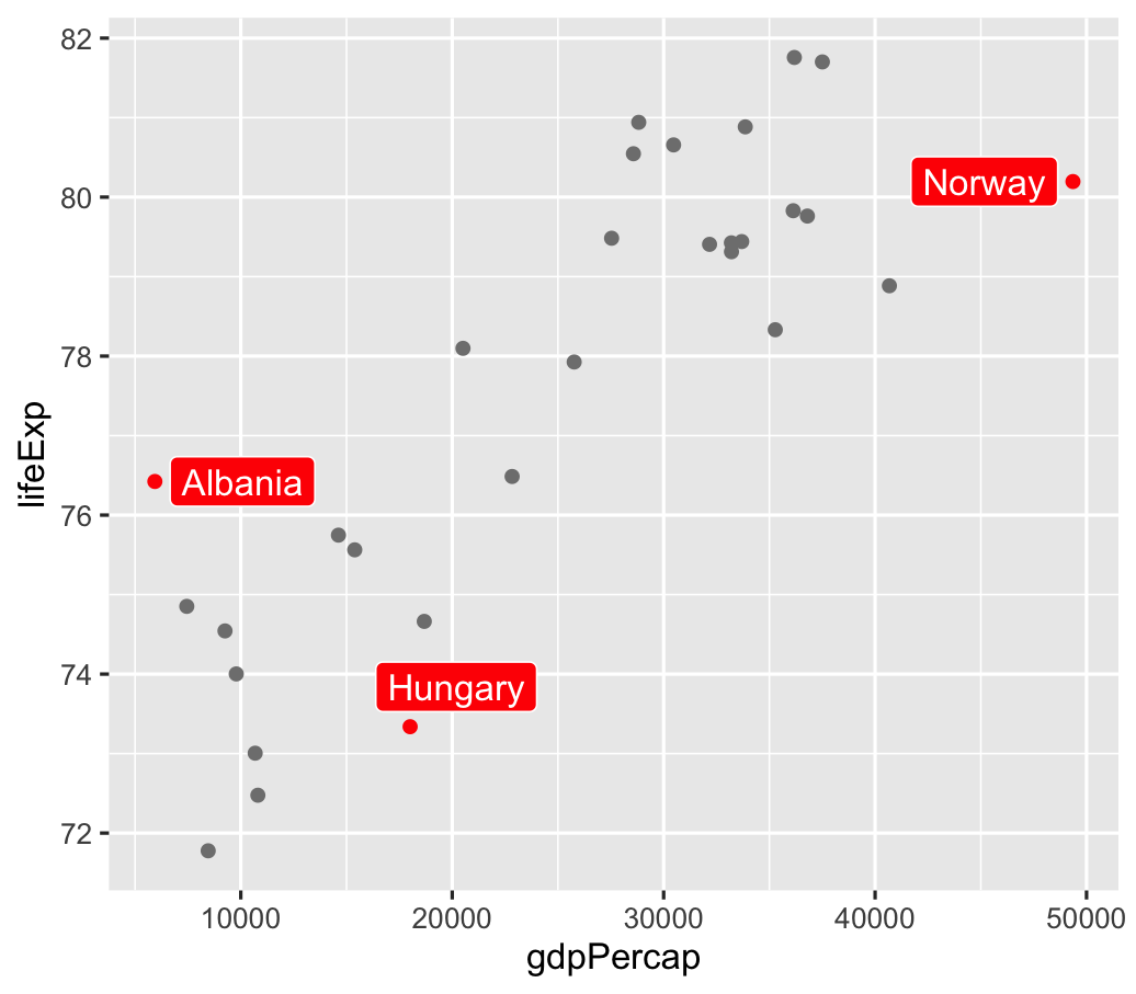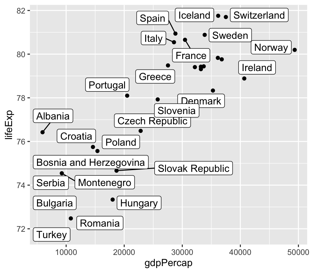 class: center middle main-title section-title-4 # Annotations .class-info[ **Session 9** .light[PMAP 8921: Data Visualization with R<br> Andrew Young School of Policy Studies<br> Spring 2025] ] --- name: outline class: title title-inv-7 # Plan for today -- .box-5.medium.sp-after[Fretting the little things] -- .box-2.medium.sp-after[Text in plots] -- .box-6.medium.sp-after[Seeds] --- layout: false name: little-things class: center middle section-title section-title-5 animated fadeIn # Fretting the little things --- layout: true class: title title-5 --- # Little details matter .pull-left.center[ <figure> <img src="img/09/stevejobs.jpg" alt="Steve Jobs" title="Steve Jobs" width="80%"> </figure> ] -- .pull-right[ <figure> <img src="img/09/apple_iie.jpg" alt="Apple IIe" title="Apple IIe" width="100%"> </figure> ] ??? https://commons.wikimedia.org/wiki/File:Steve_Jobs_Headshot_2010-CROP.jpg https://en.wikipedia.org/wiki/Apple_IIe#/media/File:Iie-system.jpg --- # Obsession with tiny details .pull-left.center[ <figure> <img src="img/09/ibm-circuit.jpg" alt="IBM circuit board" title="IBM circuit board" width="90%"> <figcaption>IBM PC Jr.</figcaption> </figure> ] -- .pull-right.center[ <figure> <img src="img/09/apple-iie-circuit.jpg" alt="Apple IIe circuit board" title="Apple IIe circuit board" width="100%"> <figcaption>Apple IIe</figcaption> </figure> ] ??? https://en.wikipedia.org/wiki/IBM_PCjr#/media/File:IBM_PCB_Jr_Motherboard.jpg http://www.willegal.net/appleii/appleii-kit.htm --- # Human-focused design .box-inv-5.large[“This is what customers<br>pay us for—to sweat all<br>these details so it’s easy<br>and pleasant for them to<br>use our computers.”] ??? Steve Jobs in *Fortune*, as quoted in [Alice Rawsthorn, *Hello World: Where Design Meets Life*, p. 110(?)](https://www.google.com/books/edition/Hello_World/b6iMDwAAQBAJ?hl=en&gbpv=1&dq=to+sweat+all+these+details+so+it%E2%80%99s+easy+and+pleasant+for+them+to+use+our+computers&pg=PT110&printsec=frontcover) --- layout: false class: bg-full background-image: url("img/09/human-interface-guidelines.png") ??? https://developer.apple.com/design/human-interface-guidelines/ --- layout: true class: title title-5 --- # Graph details: Redundant coding .box-inv-5.sp-after[One little change makes this far more accessible] .pull-left.center[ <figure> <img src="img/09/coding-not-redundant.png" alt="Non-redundant coding" title="Non-redundant coding" width="100%"> </figure> ] -- .pull-right.center[ <figure> <img src="img/09/coding-redundant.png" alt="Redundant coding" title="Redundant coding" width="100%"> </figure> ] ??? Source: Claus Wilke: https://clauswilke.com/dataviz/redundant-coding.html --- # Graph details: Consistent ordering .box-inv-5.sp-after[Again, one little change makes this far more accessible] .pull-left.center[ <figure> <img src="img/09/wrong-order.png" alt="Wrong legend order" title="Wrong legend order" width="100%"> </figure> ] -- .pull-right.center[ <figure> <img src="img/09/right-order.png" alt="Right legend order" title="Right legend order" width="100%"> </figure> ] ??? Source: Claus Wilke: https://clauswilke.com/dataviz/redundant-coding.html --- class: title title-5 # Details matter .box-inv-5.medium[Worrying about tiny details in graphs…] -- .box-5[…makes them easier for your audience to understand] -- .box-5[…improves their beauty] -- .box-5[…enhances the truth] --- layout: false name: text class: center middle section-title section-title-2 animated fadeIn # Text in plots --- layout: true class: title title-2 --- # Including text on a plot .box-inv-2.medium[Label actual data points] .box-2.small.sp-after[`geom_text()`, `geom_label()`, `geom_text_repel()`, etc.] -- .box-inv-2.medium[Add arbitrary annotations] .box-2.small.sp-after[`annotate()`] -- .box-inv-2.medium[Titles, subtitles, captions, etc.] .box-2.small.sp-after[`labs(title = "blah", subtitle = "blah", caption = "blah")`] --- # Label actual data points .left-code[ ``` r library(gapminder) gapminder_europe <- gapminder |> filter(year == 2007, continent == "Europe") ggplot(gapminder_europe, aes(x = gdpPercap, y = lifeExp)) + geom_point() + geom_text(aes(label = country)) ``` .box-2[Ew.] ] .right-plot[  ] --- # Label actual data points .left-code[ ``` r ggplot(gapminder_europe, aes(x = gdpPercap, y = lifeExp)) + geom_point() + * geom_label(aes(label = country)) ``` .box-2[Still ew. Labels are neat,<br>but cover the points.] ] .right-plot[  ] --- # Solution 1: Repel labels .left-code[ ``` r library(ggrepel) ggplot(gapminder_europe, aes(x = gdpPercap, y = lifeExp)) + geom_point() + geom_text_repel(aes(label = country)) ``` ] .right-plot[  ] --- # Solution 1: Repel labels .left-code[ ``` r library(ggrepel) ggplot(gapminder_europe, aes(x = gdpPercap, y = lifeExp)) + geom_point() + * geom_label_repel(aes(label = country)) ``` ] .right-plot[  ] --- # Solution 2a: Don't use so many labels .left-code[ ``` r gapminder_europe <- gapminder_europe |> mutate(should_be_labeled = ifelse(country %in% c("Albania", "Norway", "Hungary"), TRUE, FALSE)) ggplot(gapminder_europe, aes(x = gdpPercap, y = lifeExp)) + geom_point() + geom_label_repel( data = filter(gapminder_europe, should_be_labeled == TRUE), aes(label = country) ) ``` ] .right-plot[  ] --- # Solution 2b: Use other aesthetics too .left-code[ ``` r ggplot(gapminder_europe, aes(x = gdpPercap, y = lifeExp)) + geom_point(aes(color = should_be_labeled)) + geom_label_repel( data = filter( gapminder_europe, should_be_labeled == TRUE ), aes(label = country, fill = should_be_labeled), color = "white" ) + scale_color_manual(values = c("grey50", "red")) + scale_fill_manual(values = c("red")) + guides(color = "none", fill = "none") ``` ] .right-plot[  ] --- # (Highlight non-text things too!) .left-code[ ``` r # Color just Oceania gapminder_highlighted <- gapminder |> mutate(is_oceania = ifelse(continent == "Oceania", TRUE, FALSE)) ggplot(gapminder_highlighted, aes(x = year, y = lifeExp, group = country, color = is_oceania, linewidth = i